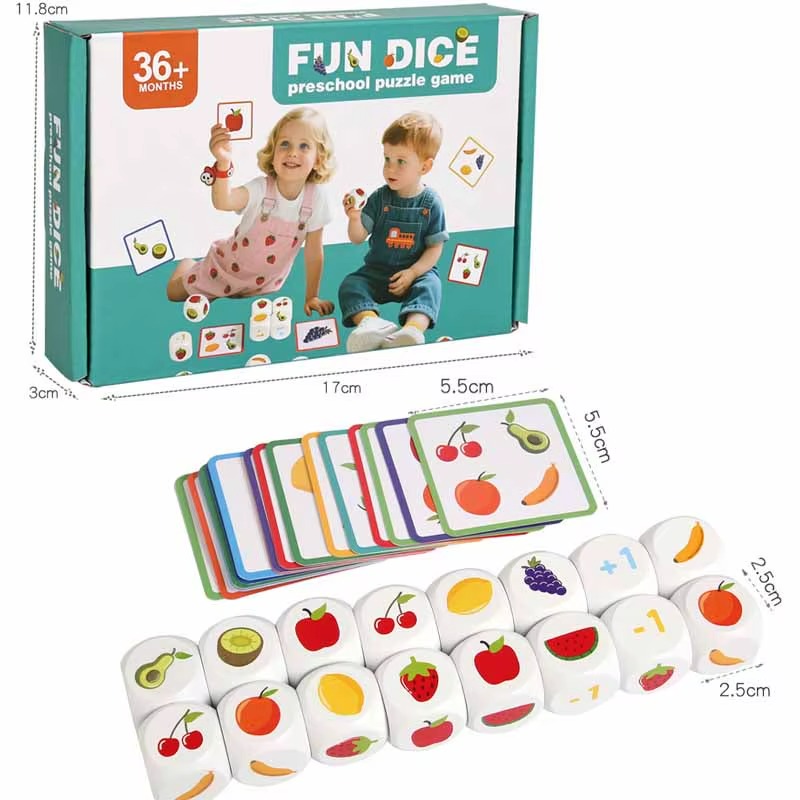 A dinâmica do jogo é simples e empolgante: a criança lança os dados e precisa identificar, combinar e organizar corretamente as frutas, desenvolvendo habilidades cognitivas enquanto brinca.