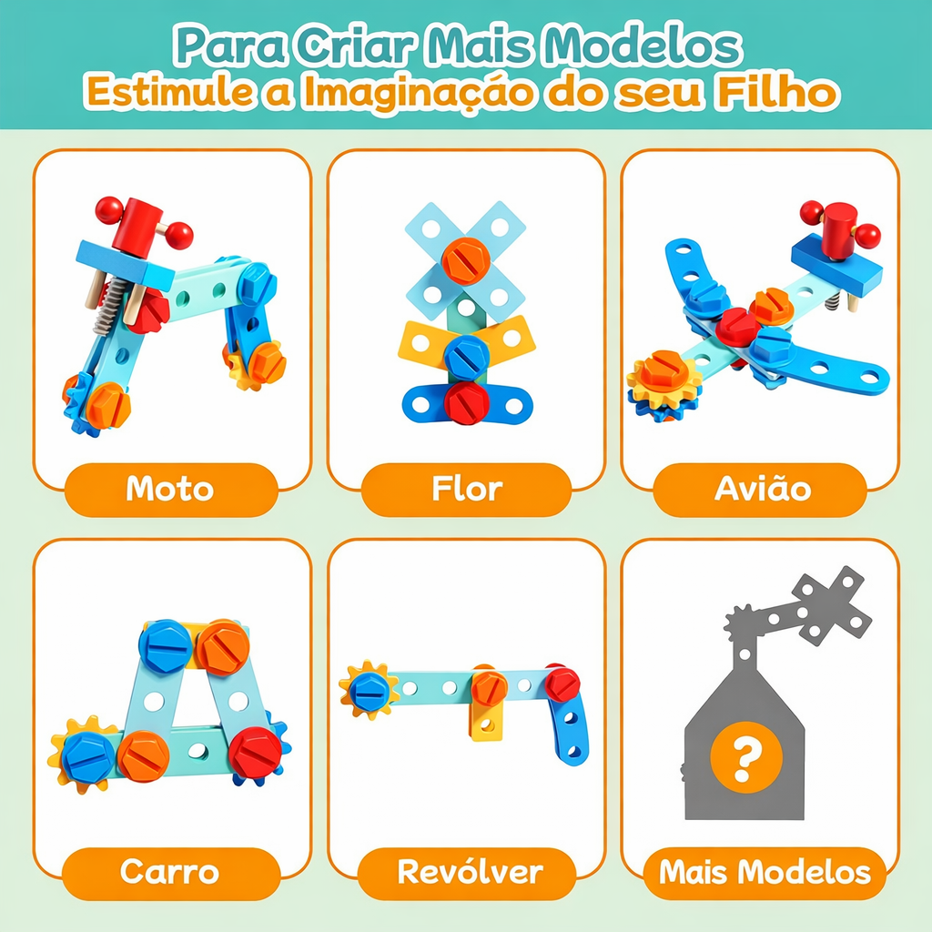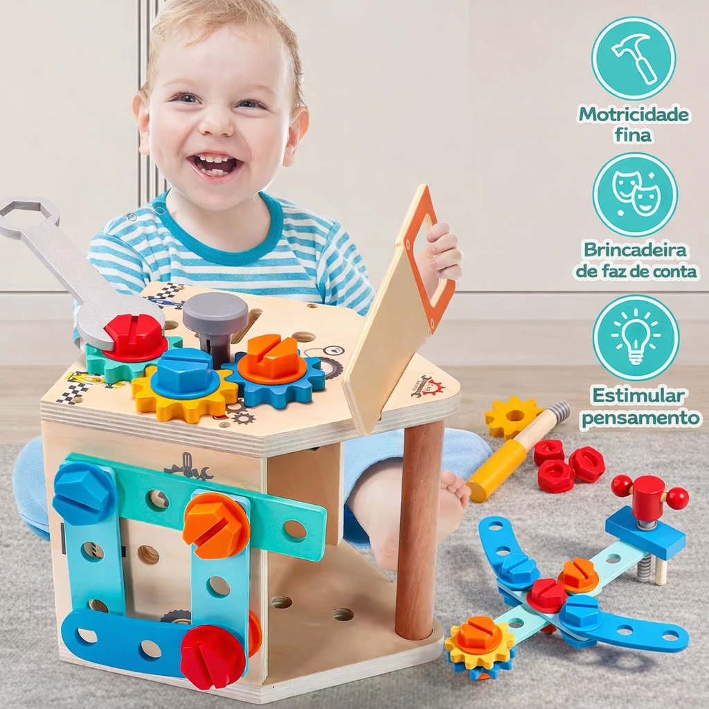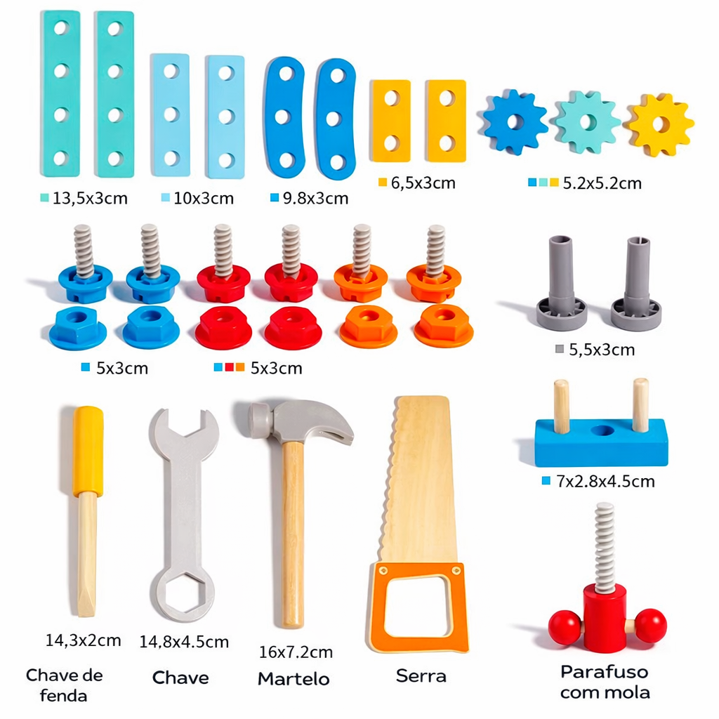Com ferramentas adaptadas para mãos pequenas, a criança pode parafusar, martelar, montar e desmontar, imitando atividades de carpintaria enquanto desenvolve habilidades essenciais. O brinquedo estimula a criatividade ao permitir a construção de diferentes modelos, como moinhos, helicópteros e formas livres, incentivando a imaginação e o pensamento lógico.