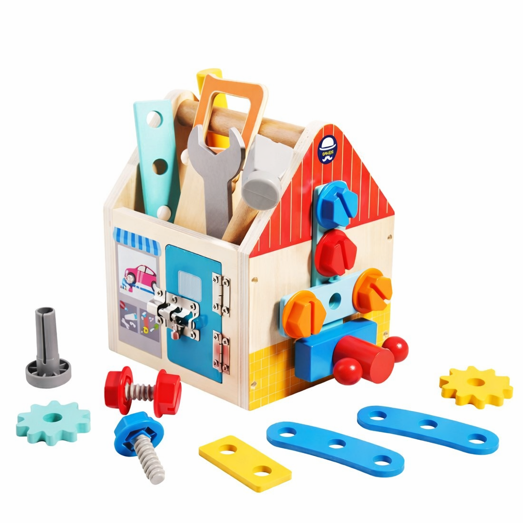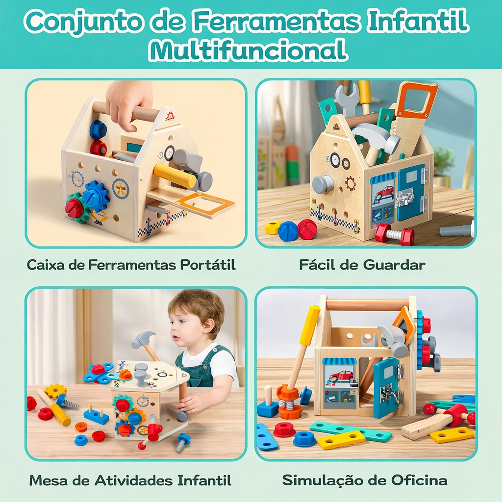A caixa de ferramentas é multifuncional: além de guardar e transportar todas as peças, ela se transforma em uma bancada de trabalho, criando um espaço próprio para a criança brincar, aprender e organizar seus materiais.