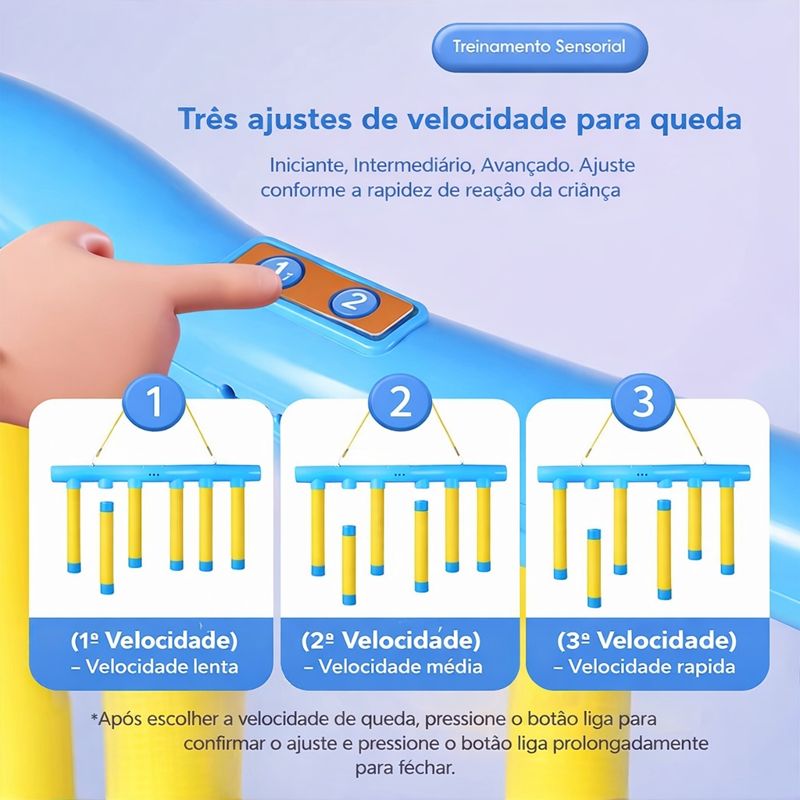 Com três níveis de velocidade, o desafio se adapta ao crescimento da criança e continua interessante conforme a evolução das habilidades.